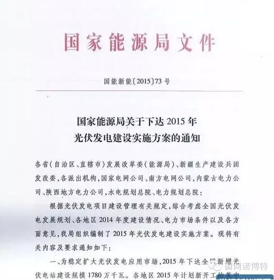 國家能源局關(guān)于下達2015年光伏發(fā)電建設(shè)實施方案的通知